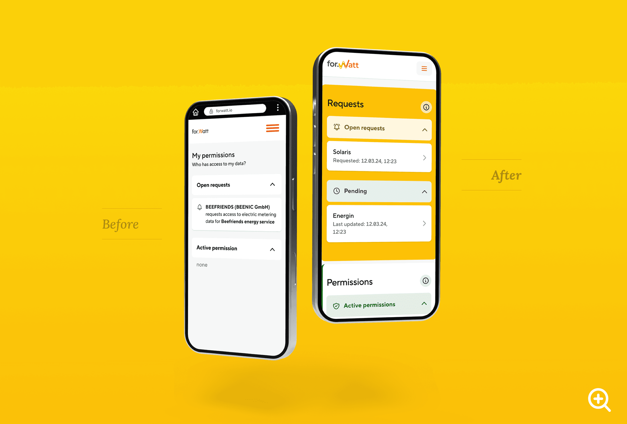 The design aimed for a joyful experience using strong color coding for branding and clarity. For private customers, requests were prioritized over permissions, as no further actions are usually required after data access is granted.