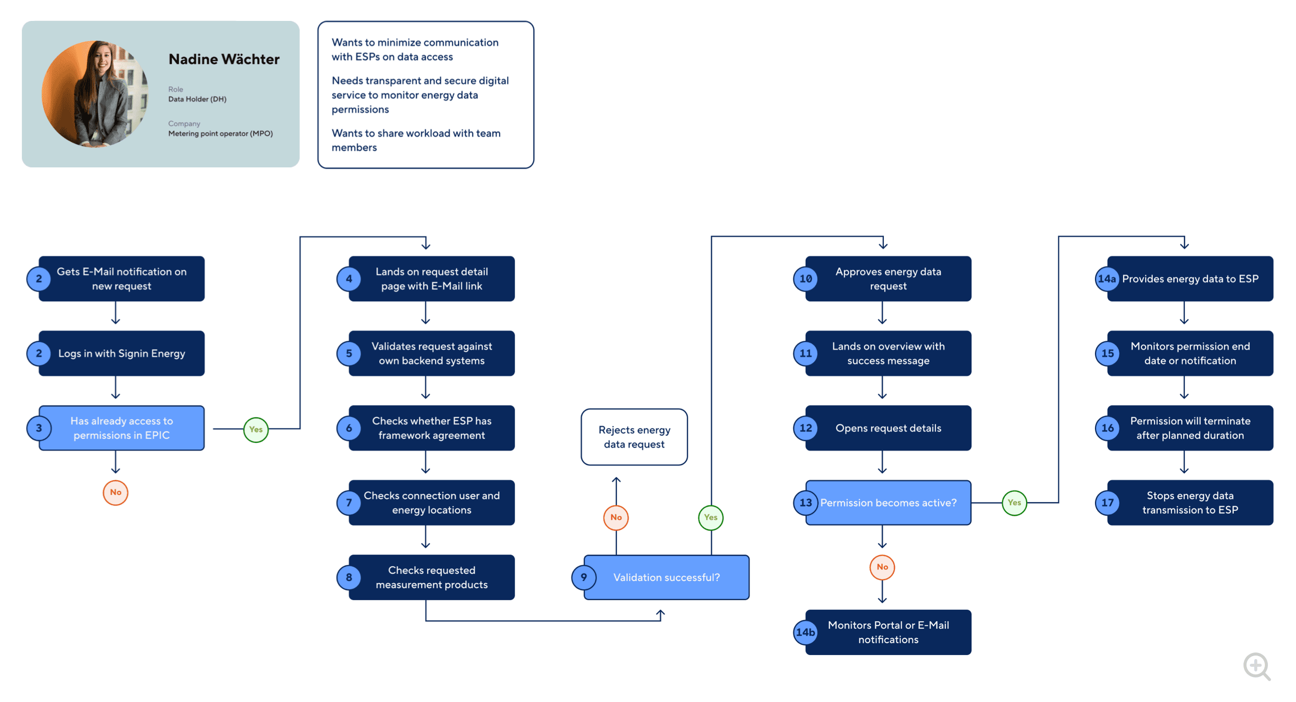An essential part of the permission service consists of partnering with metering point operators to validate requests, monitor permissions and transfer the connection users energy data during the permission period after the end user granted access to their data.